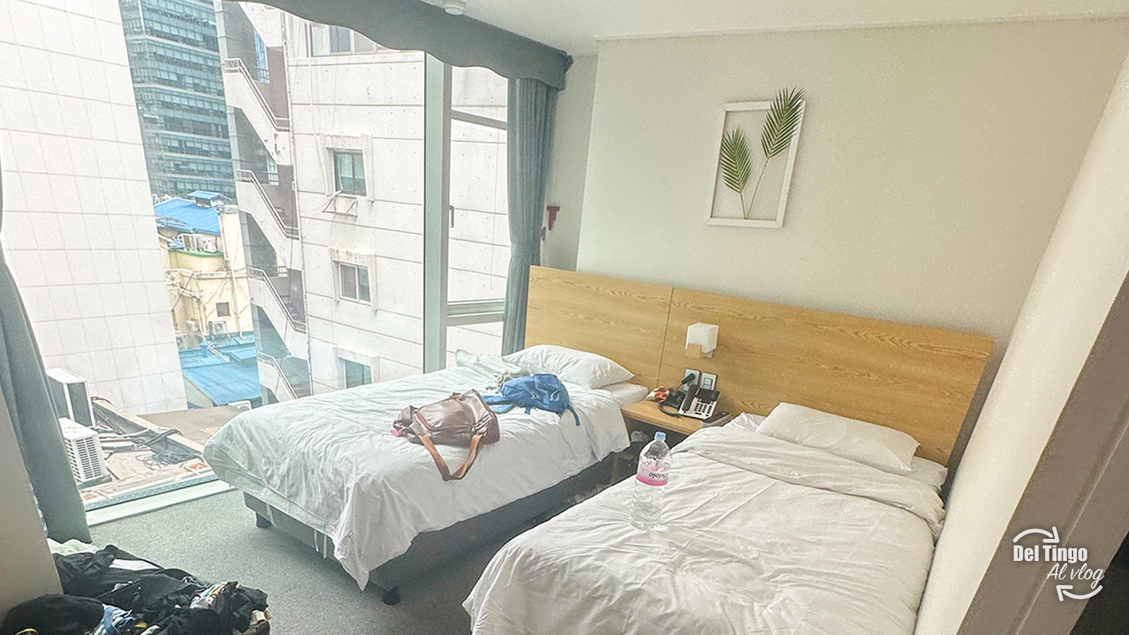 La habitación nos pareció limpia y cómoda. Tenía dos camas grandes, baño con tina, agua caliente, aire acondicionado, internet y un ventanal bastante amplio que daba hacia la calle. Ese ventanal nos gustó mucho porque entraba bastante luz y además nos daba ese primer golpe visual de estar en Corea, con vista a la ciudad y letreros en coreano.